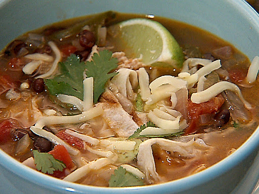 Pour into bowl add vegan shredded cheese, sliced avocados, cilantro and fried corn tortilla strips for garnish.