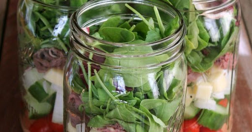Divide and layer ingredients among the mason jars, starting with dressing then tomato, cucumbers, onion, cheese, roast beef, avocado and ending with spinach/arugula and optional herbs.