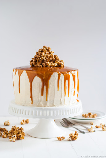Level the cakes as-needed. Fit one piping bag with a large round tip and fill with the frosting that has the caramel. Pipe two touching rings of frosting on the outside edges of two of the cake layers. Fill the insides of the rings with the peach compote. Layer the cakes so that the one cake layer without the frosting and compote is on top. Frost the cake with the vanilla frosting. Place the cake in the fridge for about 30 minutes to slightly stiffen the frosting a bit, this helps with controlling the caramel we are pouring on top. Spoon caramel around the top of the cake. I did not do it in the middle where the popcorn is so that the popcorn does not get soggy. I placed a doughnut cutter on top to make it easier to avoid the center. Use the back of the spoon to spread the caramel evenly over the top of the cake, it will drizzle down on its own. Place caramel popcorn over the center of the cake. Serve!