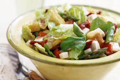 To serve the salad, dress and top with croutons or top individual servings with the croutons and pass the dressing at the table.