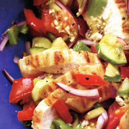 Mexican chicken salad inspired by gazpacho soup that is fresh and healthful, including cucumbers, tomatoes, tomatillos, jalapeños and topped with fresh cilantro.