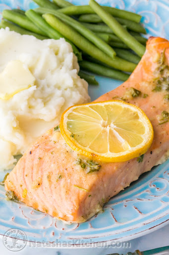 Generously brush all sides of salmon with sauce and top with fresh slices of lemon.
