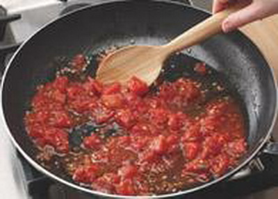 1. Heat 1 tablespoon olive oil in a large skillet. Add 2 minced cloves of garlic and cook until softened. Chop 1 (28-ounce) can whole peeled tomatoes. Add the tomatoes (and their juice) and 2 tablespoons tomato paste to the oil. Bring to a boil, reduce the heat and simmer for 20 minutes.
