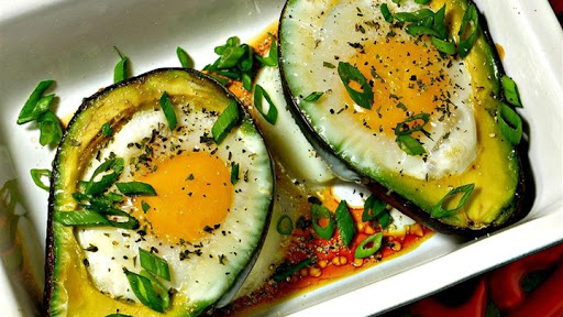 4. Gently place baking dish in the preheated oven and bake until eggs are cooked, about 15 minutes. Sprinkle bacon over avocado.