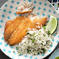 In shallow dish, combine first 3 ingredients. Coat fish in mixture; season. In nonstick skillet, cook fish in EVOO over medium until crispy, 3 minutes per side. In bowl, toss rice and cilantro; season. Serve with fish and lime.