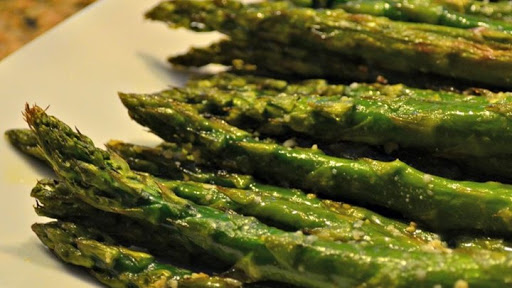 Place the asparagus into a mixing bowl, and drizzle with the olive oil. Toss to coat the spears, then sprinkle with Parmesan cheese, garlic, salt, and pepper. Arrange the asparagus onto a baking sheet in a single layer.