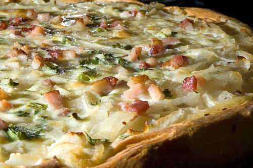 Top each pan with the onions, pour half of the egg-cream mixture on top and add the green onions and bacon.
