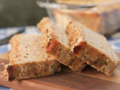 Garnish the meatloaf slices with the toasted panko and chopped celery leaves