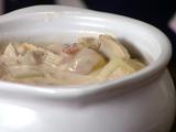 Sprinkle the flour over the onions and potato mixture and stir to combine. Gradually whisk in the reserved clam juice. When the clam juice has been whisked in and there are no lumps, whisk in the milk and heavy cream and toss in the bay leaves and thyme. Taste for seasoning and adjust if needed. Bring to a boil and reduce to a simmer and simmer until the potatoes are cooked through, 10 to 15 minutes.