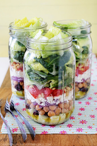 Divide and layer all ingredients into mason jars. Start with salad dressing, then cucumbers, tomatoes, red onion, cheese, olives, chicken and end with lettuce. Put mason jar top on and store in refrigerator.