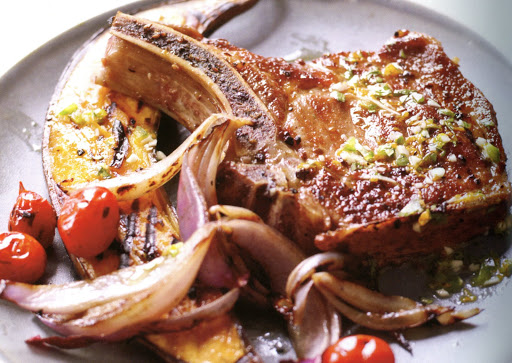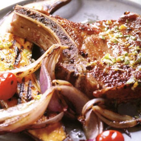 Serve a dish of grilled red onion wedges and cherry tomatoes alongside the succulent pork chops.