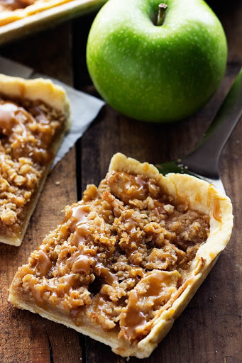 - A thin and flaky melt in your mouth crust topped with juicy apples and a crisp topping. It is drizzled in homemade caramel and perfect for feeding a crowd!