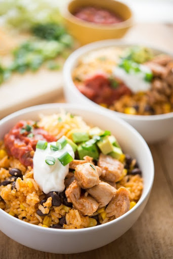 • Make ahead: If you're bringing these burrito bowls for lunch, pack the rice, beans, and chicken together in a container that can be heated in the microwave. Pack any crunchy or fresh toppings separately.