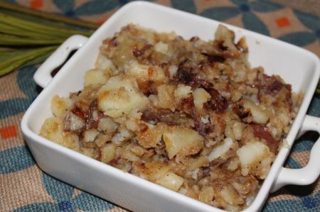As the potatoes soften, use the end of the spatula to mash and break the potatoes up. The onions will get browner and caramelize more! Enjoy.