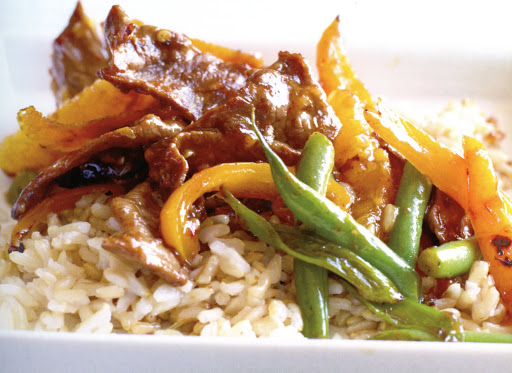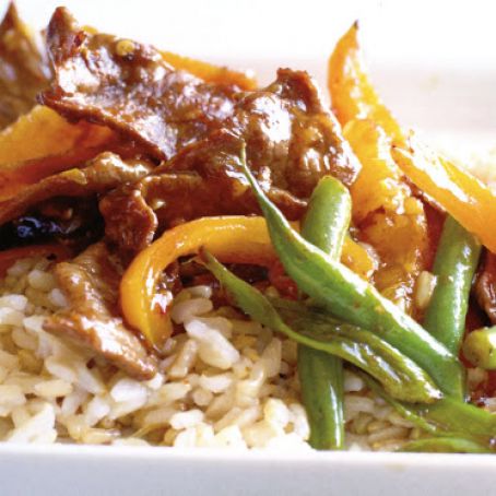 PER SERVING 1 1/2 cups orange beef and % cup rice): 400 Cal, 10 g Total Fat, 2 g Sat Fat, 0 g Trans Fat, 56 mg Choi, 538 mg Sod, 46 g Carb, 9 g Sugar, 7 g Fib, 33 g Prot, 102 mg Calc.