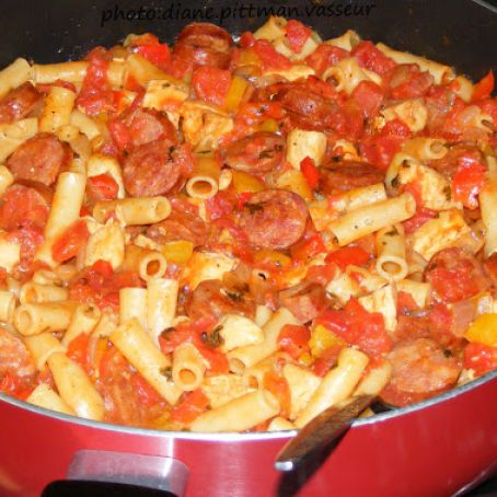 A spicy skillet meal made with smoked sausage, chicken breasts, ziti or penne pasta, red and yellow bell peppers, onions, garlic, canned tomatoes, chicken broth, and plenty of Cajun seasonings to spice up your weekly dinner recipe rotation. The creole flavors of Louisiana come together in this dish and dance on your tongue like jazz in the streets. Pair with a lightly dressed side salad or enjoy this meal on its own.