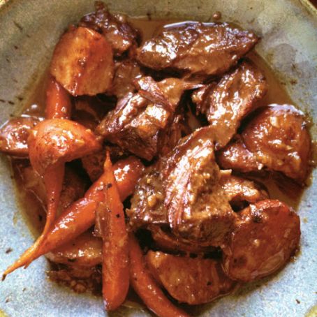 PER SERVING (1 1/3 cups stew and 1 1/2 tablespoons mustard sauce): 325 Cal, 13 g Total Fat, 5 g Sat Fat, 0 g Trans Fat, 67 mg Choi, 441 mg Sod, 25 g Garb, 4 g Sugar, 3 g Fib, 26 g Prot, 54 mg Calc.
