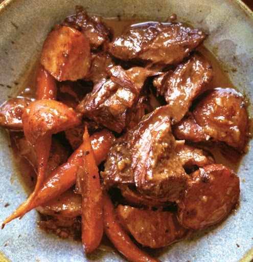 Add remaining ingredients to slow cooker. Cover and cook until meat and vegetables are tender, 4-5 hours on high or 8-10 hours on low. Serve with mustard sauce.