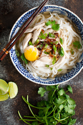 Ladle the hot broth and chicken over the noodles. Top with cilantro and a squeeze of lime. Add other garnishes as desired.