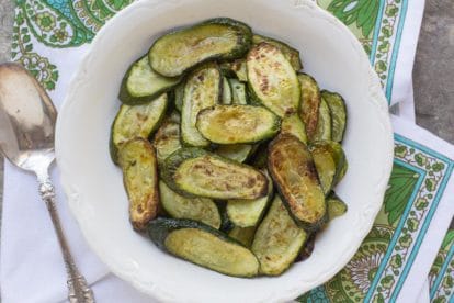 Roast for about 20 minutes, shaking the pan halfway through, until zucchini are tender and beginning to show a little blistering here and there. Zucchini are ready to serve hot, warm or at room temperature.