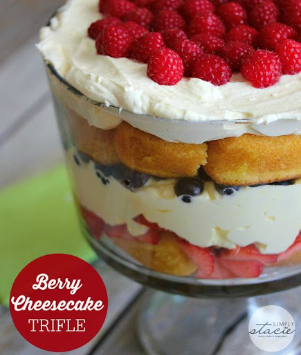I combined several recipes to make my own version of this berry cheesecake trifle. You can use several kinds of berries, or just one. TOTALLY up to you. The pic and URL is from one of the original recipes I "tweaked".