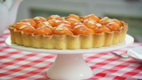 Arrange the apricot halves in circles over the top of the tart. Warm the apricot jam over a low heat then pass through a fine sieve. Brush the warm apricot jam over the top of the fruit to glaze. Scatter over the flaked almonds. Serve the tart warm or cold.