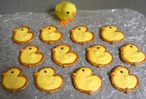 Pipe melted candy over the inside of a pretzel and use your finger to smooth it out and seal to the inside edges of the pretzel. Repeat for remaining pretzels. (I worked on 6 chicks at a time so the candy wouldn't harden too fast for the eyes and beaks to set.) Candy can be reheated if necessary.