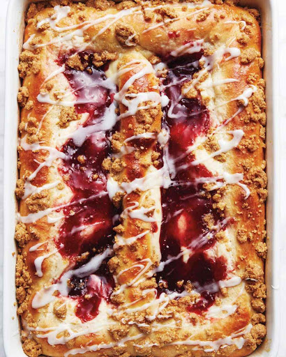 Preheat oven to 350 degrees. Divide filling evenly between two channels of dough. Spread to edges with a spatula, then spread jam over cheese mixture. Brush border and center wall with egg white. Break topping into bite-size pieces; sprinkle over top. Bake until puffed and golden and topping is crisp, about 25 minutes. Let cool completely in baking dish on wire rack, about 1 hour.