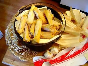 After the corn shucks are soft, take some of them out of the water, shake the water off, lay them on the counter on a towel. For clarity now, we will present a series of pictures with the instructions so you can see just how the tamale is built (Click on Picture Thumbnails for an enlarged View):