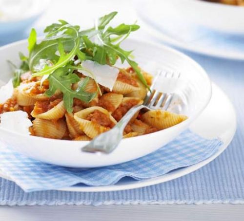 2. Cook the pasta following pack instructions. Meanwhile, blitz the sauce with a hand blender until smooth, season and return to the heat to keep warm while the pasta cooks. Drain the pasta and toss through the sauce. Serve in bowls topped with shaved Parmesan and rocket leaves, if you like.
