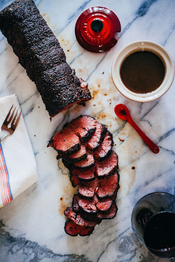 While the beef rests, make your jus. Pour 1 cup of red wine into your roaster and place it over two burners on medium heat. Use a wooden spoon to scrape up any browned bits from the bottom of the pan, and allow the wine to cook until reduced by about half, about 5 minutes. Add in your beef stock, stir to combine, and cook again, until reduced by about half, about 8 minutes or so, stirring often. Taste and add any salt or pepper if you find it to be necessary.