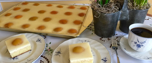Place the apricots in a sieve and drain the fruit juice in a bowl. Set aside. Mix the cooled down pudding with your handheld mixer and add in the lemon juice and crème fraîche or quark or sour cream. Mix until smooth. Spread the pudding mix onto your cake and spread it with an angled icing spatula. Place the apricots in lines 4 x 6 on the spread out pudding mix. Place the cake back in the oven on the middle rack and continue baking it for another 15–18 minutes at 200°C (400°F). When done, turn the heat off and open the door. Leave the cake in the oven with the door open for another 15 minutest. Remove cake from oven and let it cool down on the baking sheet.
