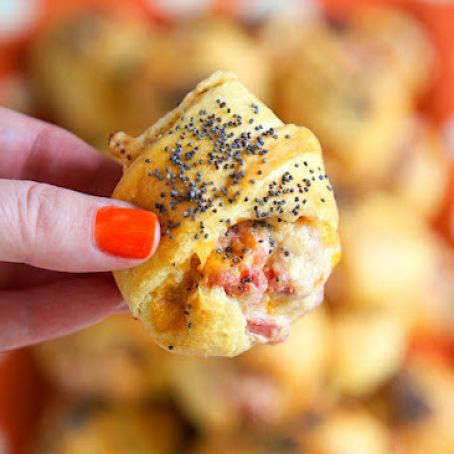 Separate crescent rolls into 24 triangles. Cut each triangle in half, forming two triangles. Scoop one tablespoon of ham mixture on the long end of each triangle. Roll up crescents and place on baking sheet. Sprinkle tops of crescents with poppy seeds.