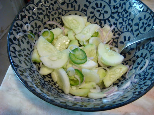 Peel the cucumbers and slice lengthwise, then into half-rounds, as thin as you have patience for. Slice the shallot in thin half-rings, or the scallions in rings. Slice the jalapeno in rings, discarding the seeds if you like. Combine all this in a bowl, then add the vinegar, water, sugar and salt and stir to combine. Let sit about 20 minutes if you have the time.