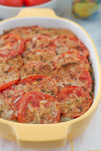 Bake, uncovered, for 45 to 50 minutes, or until the potatoes are almost cooked through. Remove the casserole dish from the oven and top with the tomato slices, overlapping the tomatoes slightly to create a pretty pattern. Top the tomatoes with the garlic, a very light drizzle of extra virgin olive oil, the breadcrumbs, fresh thyme and the remaining 1/4 cup of gruyère cheese. Put the casserole back in the oven and bake for another 10 minutes.