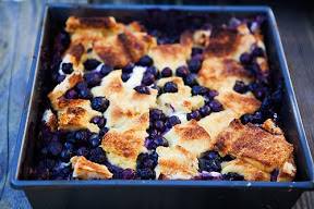 1 Preheat oven to 350° F. Grease an 8 or 9-inch square baking dish. Place half of the bread cubes in the dish. Sprinkle cream cheese cubes and half of the blueberries over the bread. Top with remaining bread cubes and blueberries.