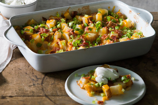 Bake 45 min. Stir; bake, uncovered, 25 min. or until potatoes are tender, topping with bacon and cheese for the last 10 min.
