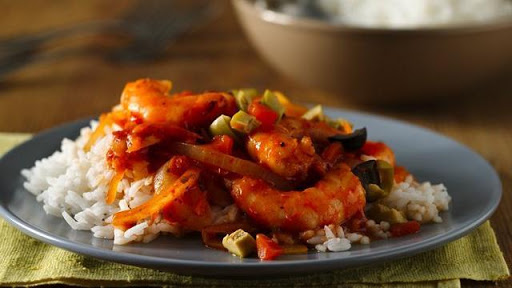 In 10-inch skillet, heat 1 tablespoon vegetable oil over medium-high heat until hot. Cook onion and carrots in oil 3 to 5 minutes or until softened. Sprinkle with lemon pepper and pepper flakes. Pour cooking sauce over all. Cover and steam 10 minutes, adding frozen shrimp last 3 minutes. Top with olives.