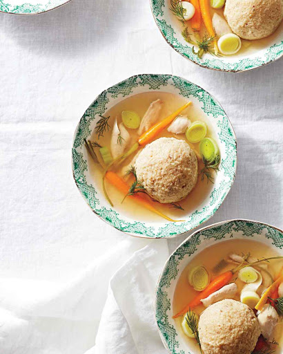 Chicken leeks, and carrots swim in a fragrant broth, but the star is the comforting matzo ball. Seltzer and baking powder are the keys to making airy spheres; their richness comes from the chicken fat, or, as Jewish bubbes call it, schmaltz.