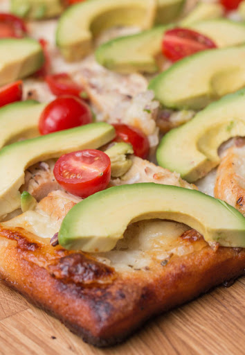 Take the pizza out and place down sliced avocados, and some grape tomatoes.