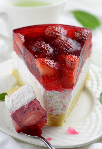 Pour the room temperature Jell-O over strawberries(the cheese cream will melt if the jelly liquid is too warm).