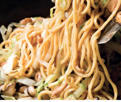 Reheat wok, swirl in remaining one tablespoon peanut oil, and add noodles. Stir-fry 30 seconds, moving constantly to heat through. Swirl soy sauce-rice wine mixture and add to wok along with chicken-vegetable mixture and scallions. Sprinkle on 3/4 teaspoon salt and stir-fry a minute or 2 until chicken and vegetables are heated through.
