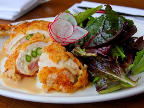 Place a slice of ham, three asparagus tips and two slices of cheese on each chicken breast. Fold each chicken breast in half over the ham, asparagus and cheese. Press the edges firmly together to seal.