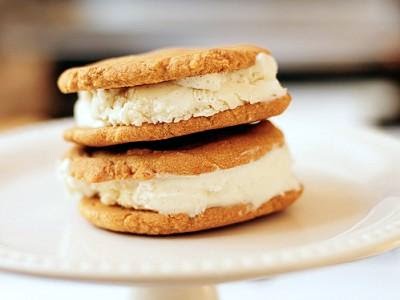 When cookies have cooled, place one scoop of vanilla ice cream (or other favorite ice cream flavor) on the flat side of one cookie and gently press another cookie on top, being careful not to break cookies.