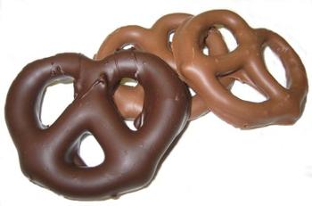 Note: As you're dipping, the chocolate may cool and thicken too much to enable you to dip the pretzels easily. If so, reheat gently over hot water on low heat (water should not touch the bottom of chocolate bowl), stirring often, just until slightly warm. It might also be helpful to transfer the melted chocolate mixture into progressively smaller bowls as you dip. Don't try to use up the last bit of melted chocolate; the dipped pretzels won't look as smooth (this is a good place to use the smaller pieces and crumbs for a "cook's treat").