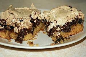 Cream margarine, 1/2 cup of the brown sugar, vanilla, egg yolks, and water. Next, sift together flour, baking soda, baking powder and salt, and add to creamed mixture. Spread in greased 9 x 13" pan. Sprinkle with chopped nuts and chocolate chips. Make a meringue topping with the remaining brown sugar (1 cup) and egg whites, whipped together at high speed until it turns an off white color - abt 2 min. Very carefully spread the meringue on top of the chocolate chips. Bake at 375 degrees for 25 - 30 minutes until meringue is light golden.