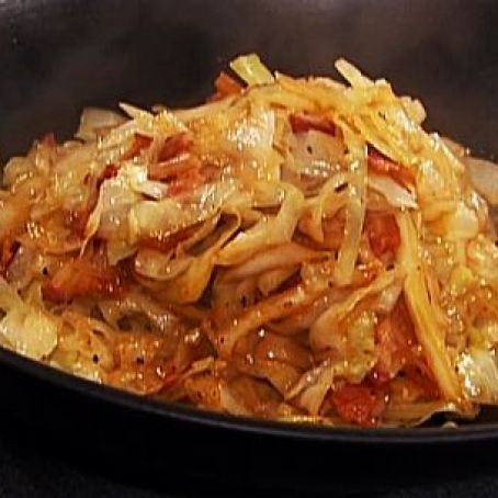 Pour off all but 1 tablespoon of the fat from the pan, then return it to medium heat. Add the onion and saute for 5 minutes, or until golden brown. Add the cabbage and toss occasionally in the pot for 3 or 4 minutes, or until the cabbage begins to wilt and is well mixed with the onions.