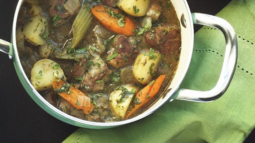 Transfer meat to a plate using a slotted spoon. Bring stew to a boil and cook, skimming off fat, until stew is reduced and thick, 10 to 12 minutes.
