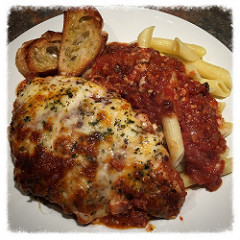 Ladle the tomato-olive sauce over the chicken and sprinkle with mozzarella, Parmesan, and basil. Bake the Chicken Parmesan for 15 minutes or until the cheese is bubbly. Serve hot with spaghetti.