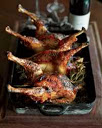 Reduce the oven temperature to 325°. Rotate the chickens in the pan and brush with the remaining glaze. Roast the chickens for about 45 minutes longer, until the juices run clear when the thighs are pierced; turn the pan halfway through roasting. Transfer the chickens to a carving board and let rest for 15 minutes. Carve the chickens and serve.